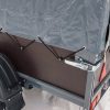 V-образное дышло выдерживает сильные динамические нагрузки. Дно прицепа выполнено из многослойной ламинированной фанеры, устойчиво к износу и воздействию влаги. Борта выполнены из многослойной ламинированной фанеры. Задний и передний борта откидные. Рессорная подвеска с гидравлическими амортизаторами сохраняет стабильную плавность хода при разной загруженности прицепа. Ось рассчитана на нагрузку 750 кг, ступицы оборудованы защитными колпаками, подшипники не требуют дополнительной смазки и регулировки на протяжении всего срока службы. Жгут электропроводки убран в защитный гофрированный кожух.